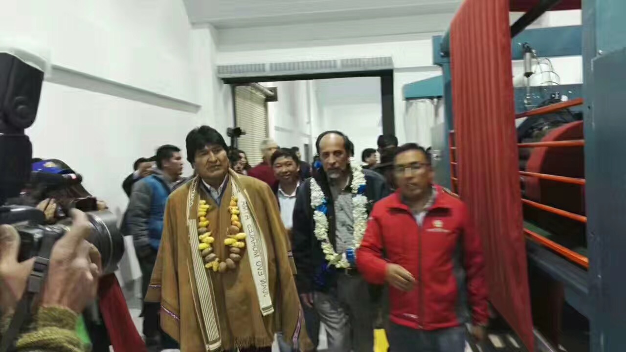 近日,多民族玻利維亞國總統(tǒng)埃沃·莫拉萊斯參觀該國國企Yacana公司Kallutaca-Laja羊駝毛紡織加工場工程,該企業(yè)購置了我企業(yè)多臺后整理設(shè)備,起毛機(jī)、剪毛機(jī)、燙光機(jī)、定型機(jī)等。